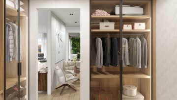 衣柜和梳妝臺連在一起,既保證了臥室裝潢的整體感,又能節(jié)省不少空間自由活動。特別是女主人會更喜歡這種組合的設(shè)計方式,穿衣打扮都在一起,省時省力更節(jié)省空間。