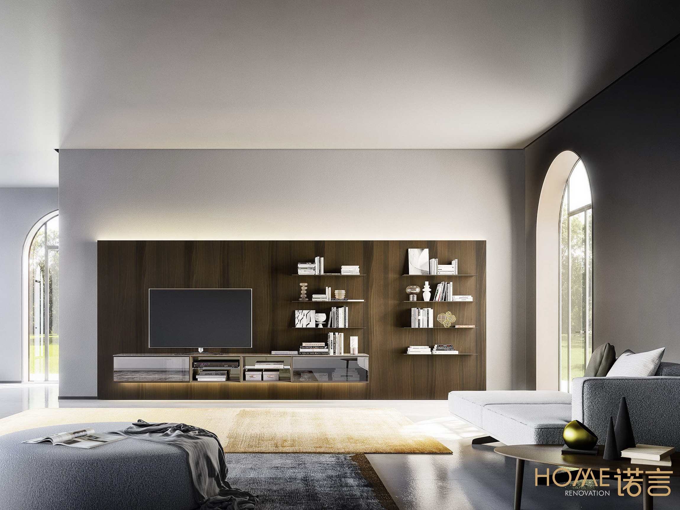 如果客廳的活動(dòng)區(qū)域比較寬敞,可以考慮將整面墻做成整墻式電視柜,以電視為中心,兩側(cè)裝飾柜可采用封閉式與開(kāi)放式結(jié)合的設(shè)計(jì)格局,讓整體效果更加有層次感。整墻式電視柜,更有效地利用空間,從而做到收納功能最大化,適合人口數(shù)量多,收納需求大的家庭使用。