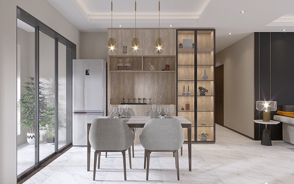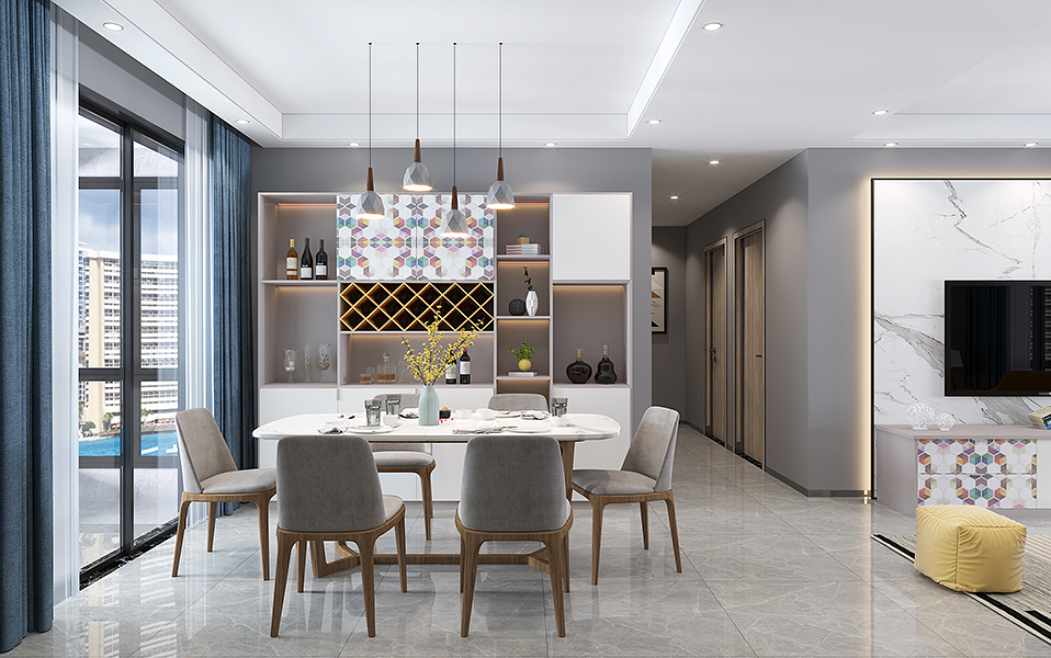 餐邊柜可以儲存餐飲相關的食材、也可以作為隨身用品的一個收納區(qū)域,同時,平常需要用的小家電也可以放在餐邊柜內(nèi),餐邊柜可以起到很好的收納作用,使整個餐廳區(qū)域更加干凈整潔。